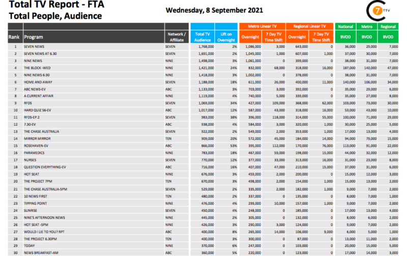在9月8日最新的《每日综合电视总报告》中,Seven News是全美线性和BVOD电视节目中排名第一的节目,有176.8万观众,其中BVOD有3.6万观众。
