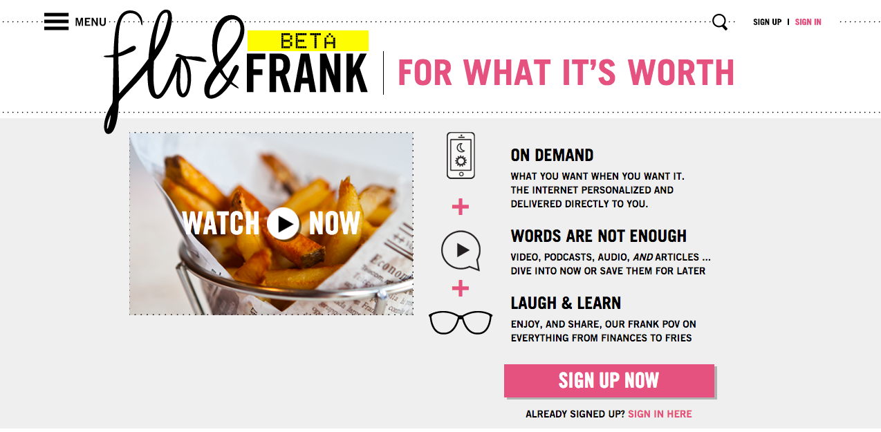 ”在我们的测试阶段,我们很高兴你的一部分,因为没有你我们就不知道什么是不工作,我们提供的选择六个内容类别,将通过电子邮件或手机在一天的时间(s)您选择,通过三个风格的交付——文章、视频和播客。另外,每个页面弗洛和弗兰克的购物节相关内容。