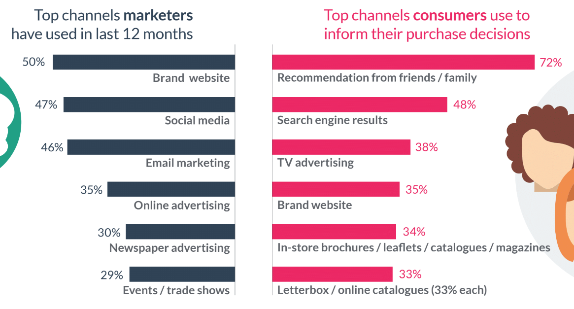 根据2018年Salmat营销报告,营销人员相信品牌网站(50%)和社交媒体(47%)消费者使用的是两个渠道,然而,消费者说,他们得到他们的购买决策的建议(72%)和搜索引擎结果(48%)。