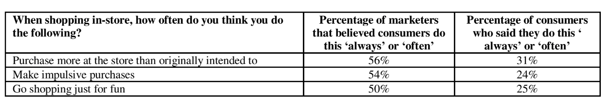当被问及比例的人们经常在商店购买超过他们最初计划,营销人员说56%,但是只有31%的消费者表示,他们总是或经常这样做。