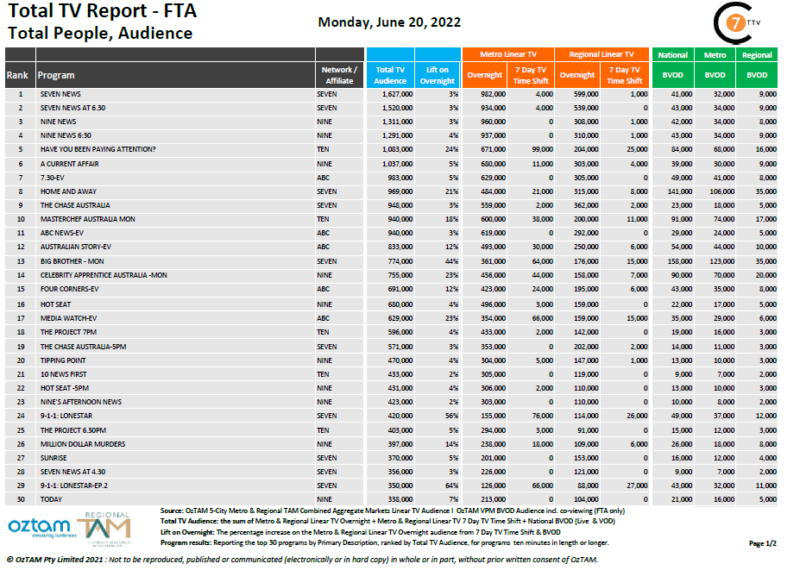 在6月20日最新的每日综合电视总报告中,Seven News是全国排名第一的节目,拥有162.7万观众,其中包括41000名BVOD观众,同比增长3%。本周涨幅最大的是《9-1-1:龙星在七号》的一集,涨幅达64%,共计35万观众收看。