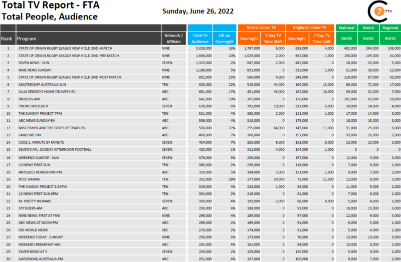 在6月26日的最新每日整合电视报告中,周日的原产地游戏是全国范围内排名第一的计划,其中有302.8万观众,其中包括402,000个BVOD的观众和16%的隆起。本周最大的提升是NCIS:夏威夷的一集,夏威夷十分以29%的速度,并向总观众播出了322,000。