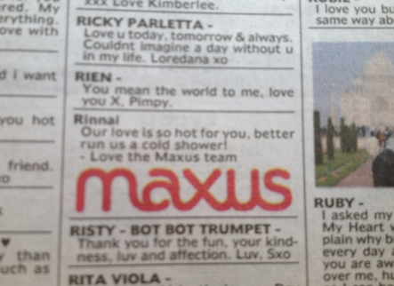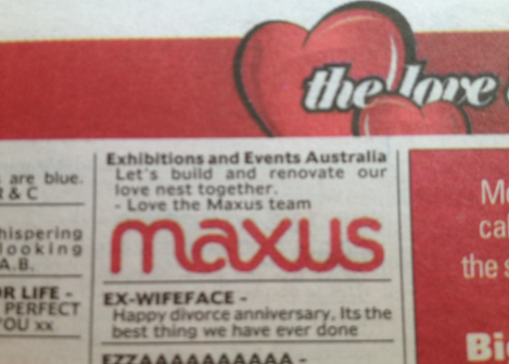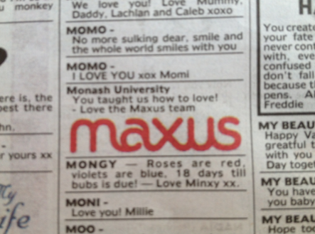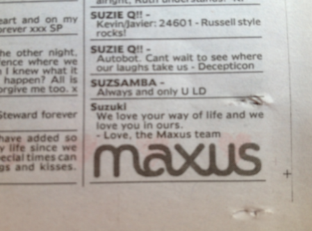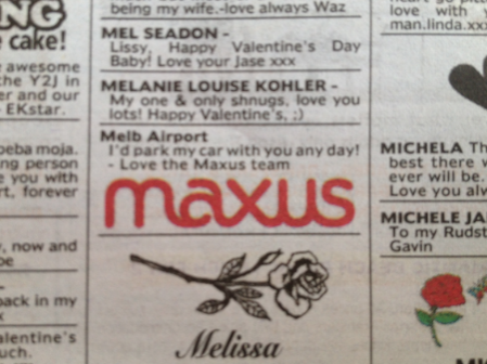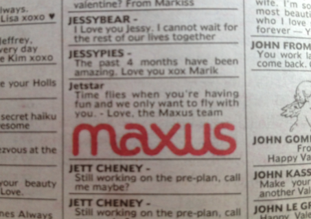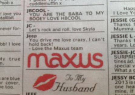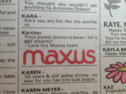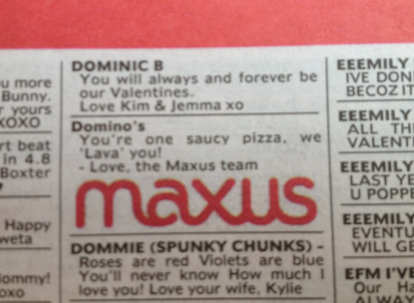 新闻 Maxus向客户展示了一些情人节的爱 2013年2月14日12:43 通过 罗宾·希克斯 今天,Maxus在《先驱太阳报》和《每日电讯报》上刊登了一系列广告,向所有客户展示情人节的爱。 这家媒体机构的分类广告区充斥着对客户的深情致敬,在墨尔本的客户包括Susuki、达美乐披萨、Jeep、Hungry Jack’s、墨尔本机场和莫纳什大学。 每个广告都为每个客户量身定制,比如Jeep的小夜曲中就有这样的信息:“你让我爱疯了,我无法抑制!”” 广告 广告