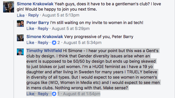 “首先,一些男性抱怨说,他们没有收到‘广告技术女性’小组的邀请。如果我们都同意在媒体行业为女性提供平等权利的运动是一项崇高的事业,为什么我们需要一个像绅士杜松子酒俱乐部这样的反运动来反对它?