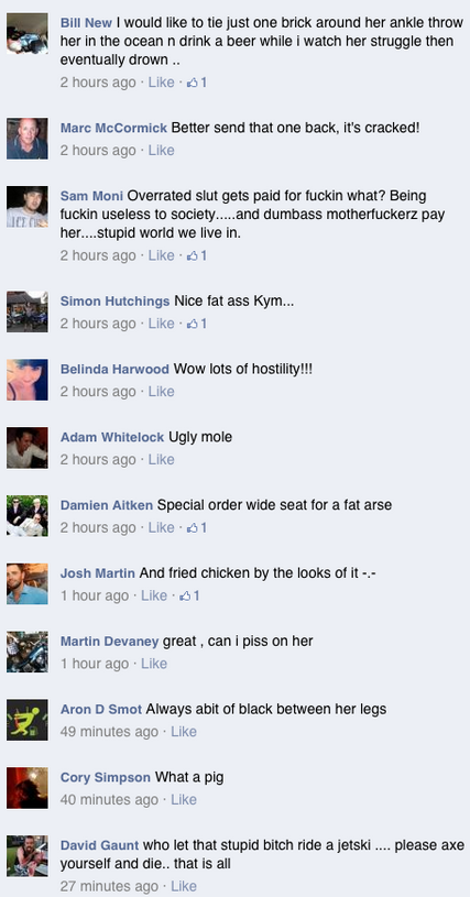 事实上,你的例子根本站不住脚。大多数的评论,尽管显然来自不谙世道的男性和女性,但似乎都是针对金·卡戴珊本人的,而不是对女性的普遍仇恨。除了一些品味很差的评论(我可能会觉得品味很差,其他人可能不会),大多数都可以被理解为人们试图粗俗的幽默,或嘲笑名人。