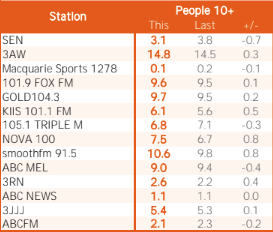 ABC墨尔本下跌0.4分,占10%,而Macquarie Sports Radio根本没有出现在早餐老虎机中。
