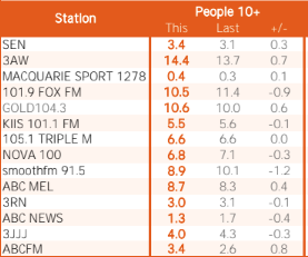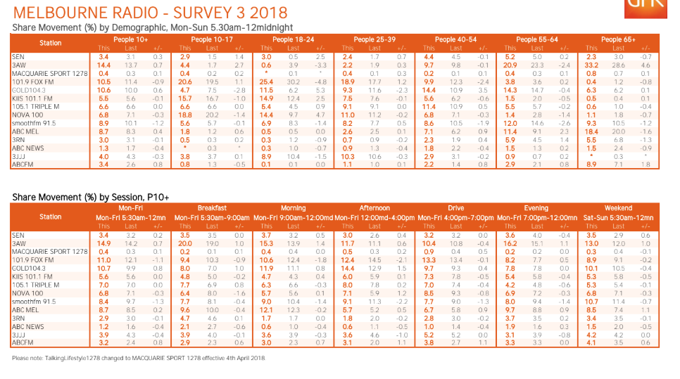 3AW和澳大利亚广播公司(ABC Melbourne)成功挤掉了SEN的3.2%,3RN的2.8%和Macquarie Sport Radio的0.9%的份额。