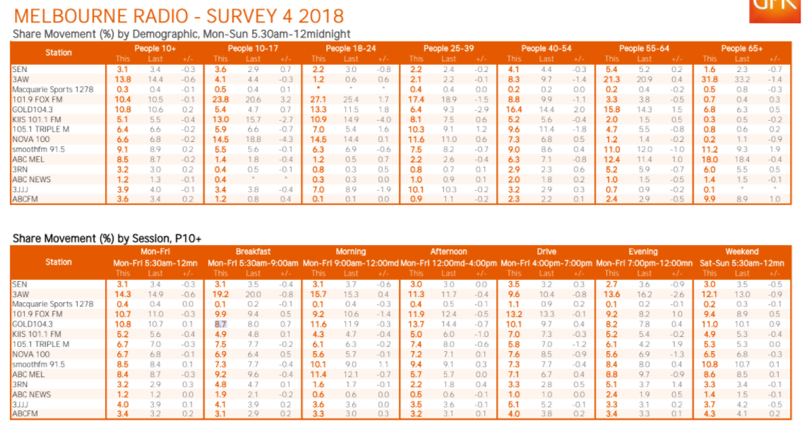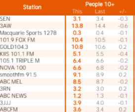 总体而言,3AW是墨尔本排名第一的电台,尽管整体下降了0.6个点。该电视台最终占有13.8%的市场份额。但这一差距已经缩小,Gold FM将其FM收视率的领先优势扩大到10.8%。这一结果略高于福克斯FM的10.4%。