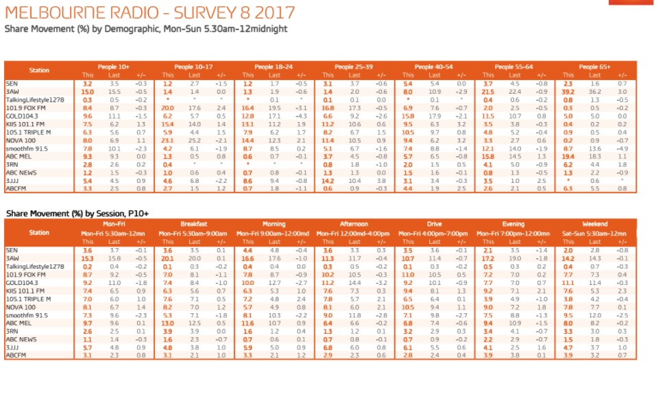 墨尔本ABC也以13%的份额击败了所有调频电台,比上次调查提高了0.5个百分点。