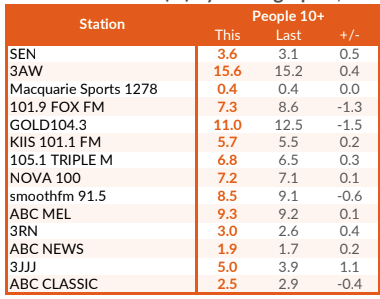上面所说的黄金调频的7.8%,下降1.3%后,福克斯调频的6.7%,下降了2.0%。3 aw仍然是顶级早餐计划,持有20.2%的市场份额,尽管下降了0.4%。