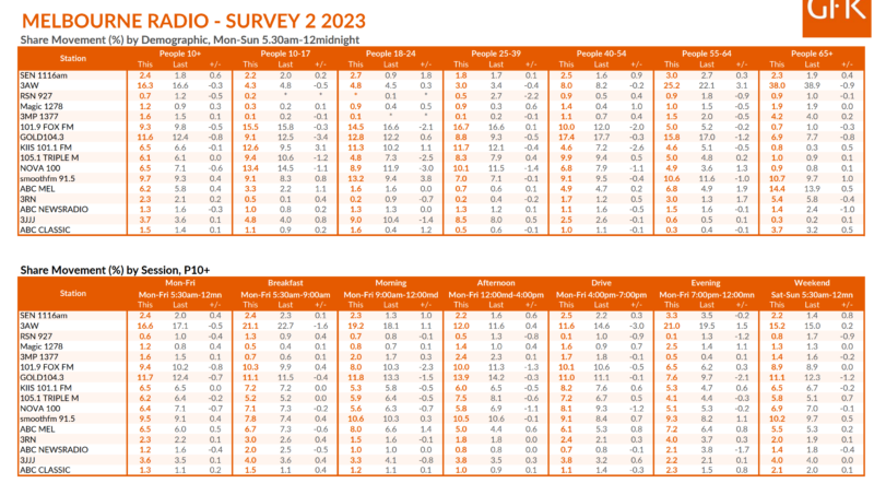 GfK电台收视率调查的第二年在墨尔本认为一切照旧九广播3 aw继续领导包,然而,FoxFM早餐三人继续充电。