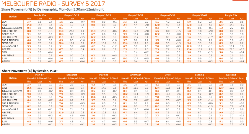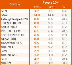 在这两个频谱(AM和FM)中,总受众份额的胜利是3AW,占14.8%的份额,因为它比上一个调查的14.4%提高了。