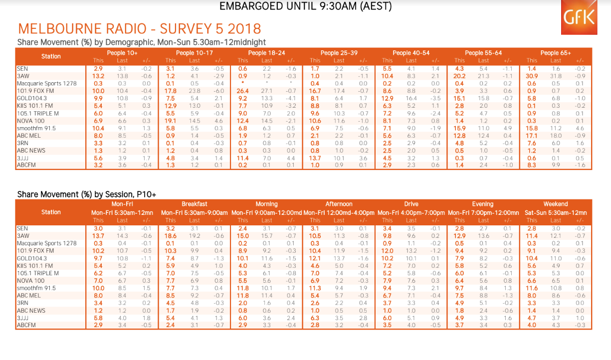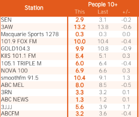 随着AM台的加入,3AW在下降0.6个收视率点的情况下,以13.2%的收视率再次成为赢家。