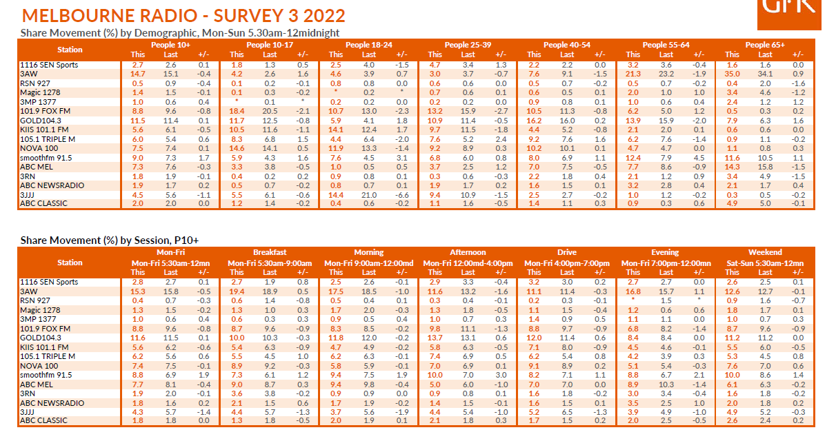 Nine Radio’s 3AW again remained the market leader in the nation’s largest metro radio market, with a 14.7% share, dropping back 0.4 points from the last book, while ARN’s Gold FM also retained its position as the FM market leader, moving the dial by 0.1 point to a 11.5% share overall.