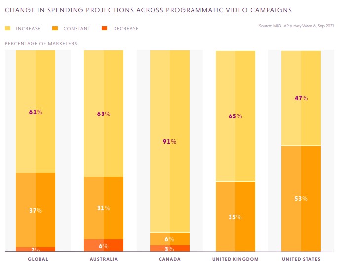 对可编程音频广告支出预测可能仍停滞不前的大多数营销人员在美国和澳大利亚,虽然轻微增加1 - 20%之间(比2021年预算)可能在加拿大和英国。