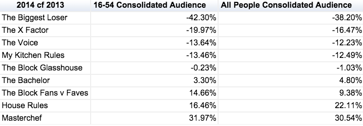 其中最古老的节目《十大减肥王》(Ten’s The Biggest Loser)名副其实,在今年播出的过程中,它的收视人数减少了45%。然而,Ten 's Masterchef是最大的赢家,比去年增长了31,91%。