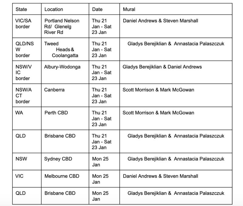 这些壁画将在以下地点和日期在澳大利亚整个澳大利亚旅行。