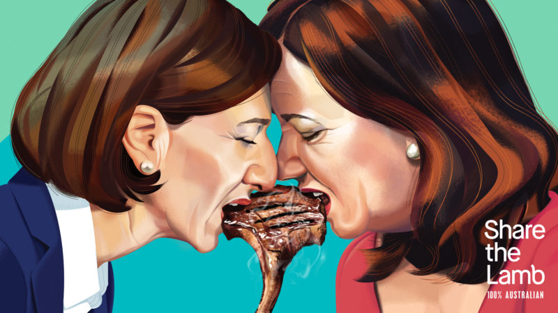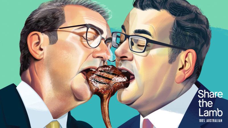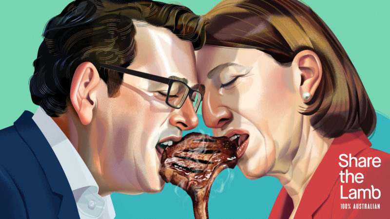 Positioned in city CBDs and regional centres close to state borders, out-of-home billboards parodying the famous Berlin Wall mural ‘My God, Help Me to Survive This Deadly Love’ – otherwise known as ‘Fraternal Kiss’ – depict Australia’s political leaders simultaneously taking a bite of some lamb.
