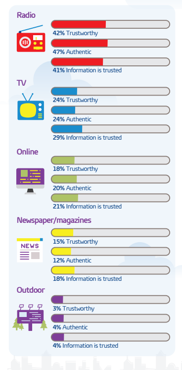 这项调查基于GfK最初的广播评级调查,每年进行四次。调查表明,广播不仅是最受信任的媒体,而且是最真实的媒体。