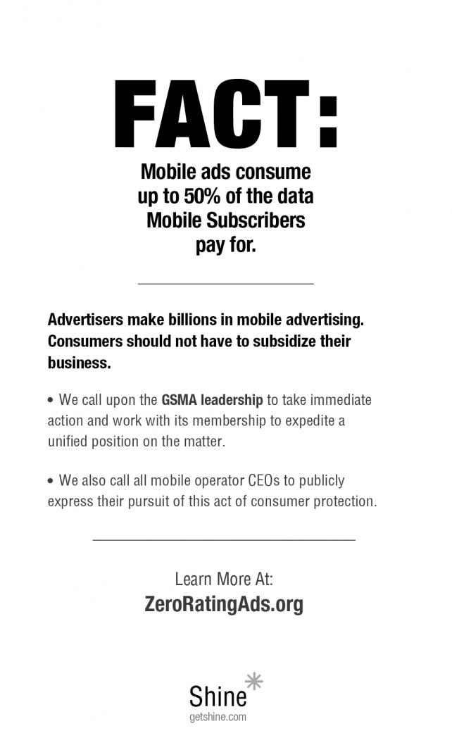 该广告称:“移动广告消耗了移动用户付费数据的50%。”“广告商在移动广告上赚了数十亿美元。消费者不应该为自己的企业提供补贴。”