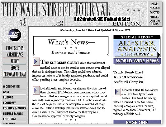 “从一开始,我们就很清楚,我们需要报道印刷版《华尔街日报》所关注的所有问题和情感,尽管我们是在线的,尽管我们是年轻的员工。”《华尔街日报》(几乎)从未免费在线阅读。20年前的今天,当完整的网站——当时叫做《华尔街日报互动版》——正式上线时,有几个月是免费的。