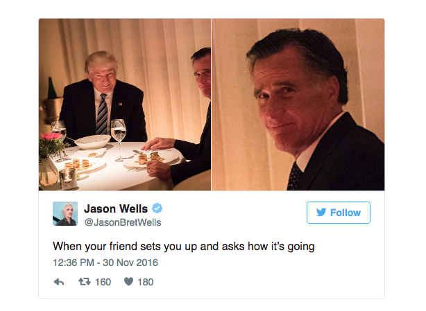 当选总统唐纳德·特朗普正在端着一碗大蒜汤微笑。在桌子的另一边,前共和党提名人、现任国务卿候选人米特·罗姆尼眉头紧锁,笑容满面。