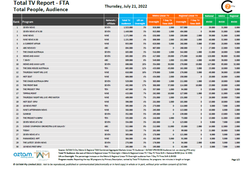 在7月21日的最新每日整合电视报告中,有七个新闻是全国各地的最佳节目,其中有152.3万观众,其中包括39,000个BVOD,而升高为3%。该节目在前20名节目中最大的振奋节目是Home and Away的一集,七个节目的升高为28%,总共800,000台电视观众观看,而BVOD则为127,000。