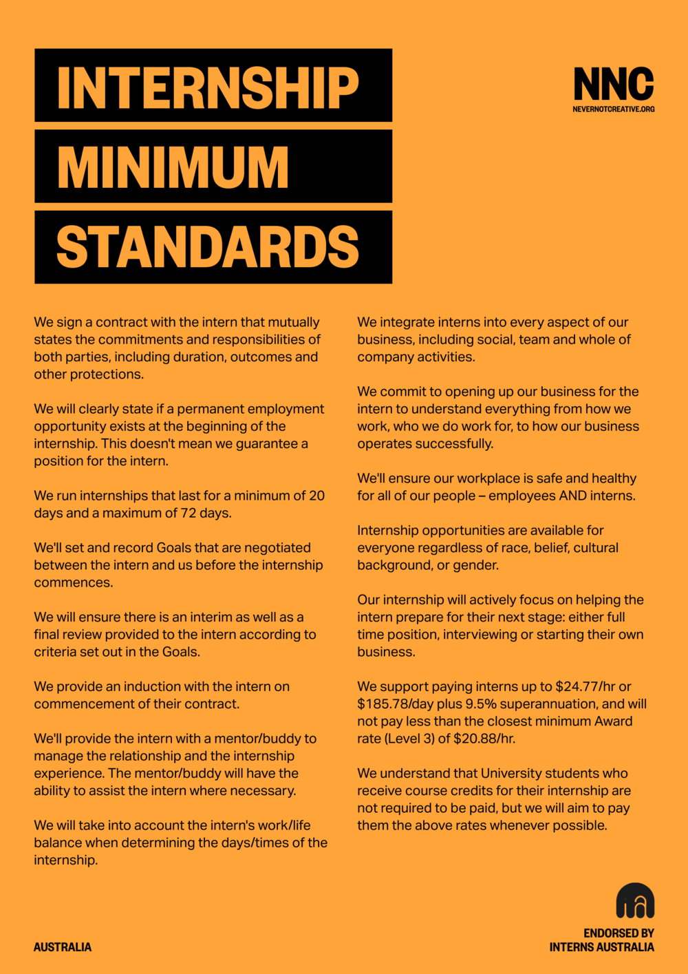 实习最低标准也要求签署国承诺为实习生提供平等机会无论种族、信仰、文化、背景或性别,并考虑到实习生的其他承诺,如工作和大学,在确定实习的安排。