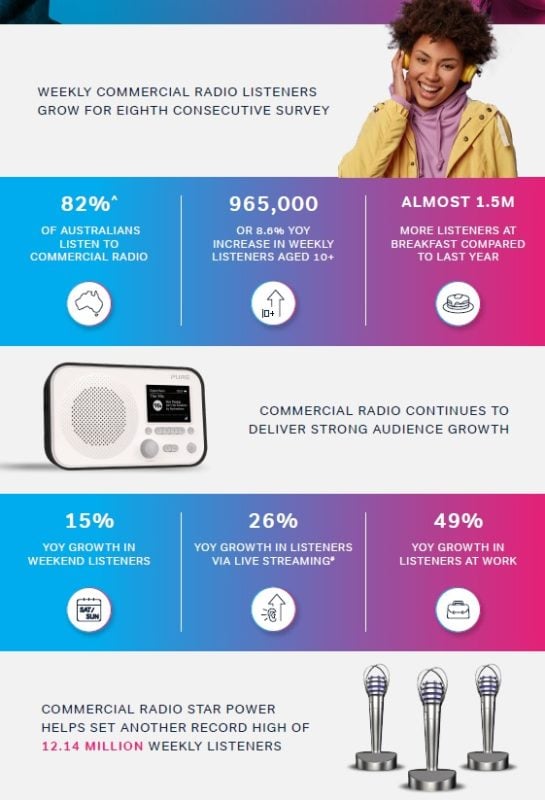 在五大城市市场,10岁以上的澳大利亚人在工作时间收听商业广播的人数激增49%,每周超过247万人。