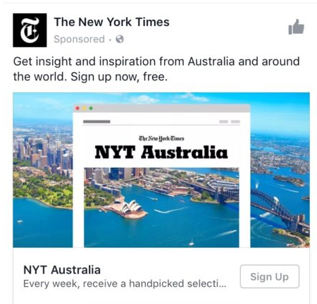 《纽约时报》赞助的澳大利亚品牌出现在Facebook发布,旨在推动Facebook用户注册为《纽约时报》。