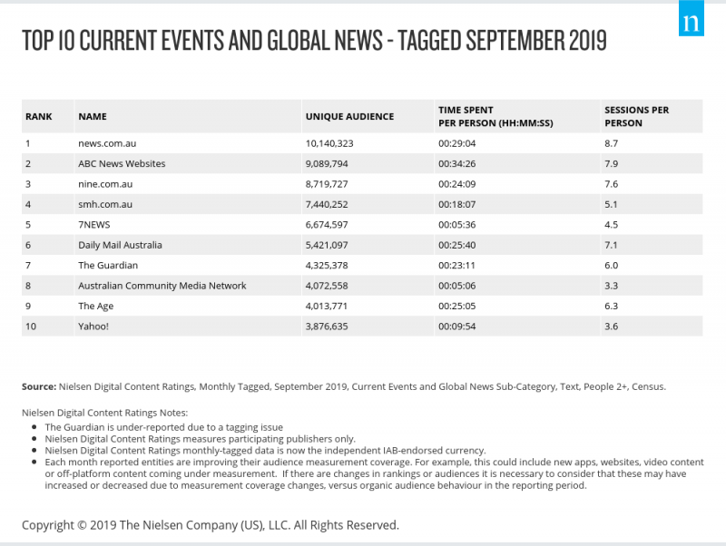 在排名前十的出版商中,9月份唯一出现下滑的是Nine的Smh.com.au,其独立读者数量下降了3%,至744万,《卫报》下降了5%,尽管尼尔森报告称标题存在标签问题。