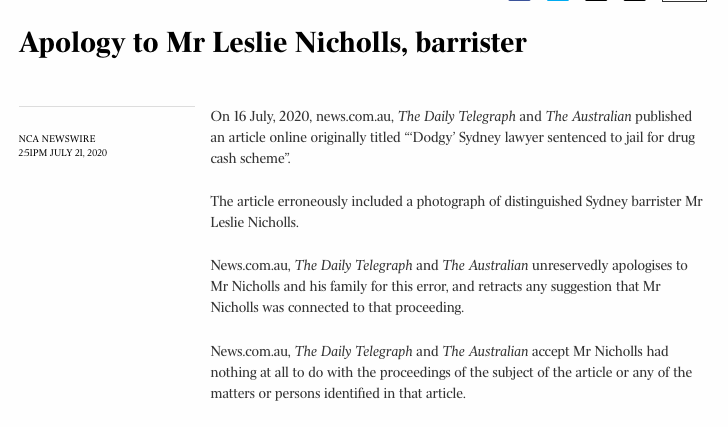 昨天下午,新闻公司新成立的新闻NCA Newswire,发表道歉在作品中承认“错误地包括一张杰出的悉尼大律师莱斯利·尼科尔斯先生的照片”。