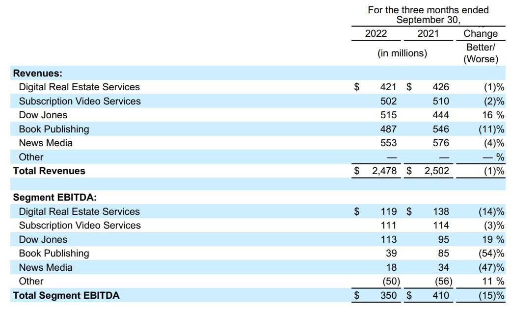 新闻集团今天公布,2023财年第一季度总营收为24.8亿美元(38.1亿澳元),同比下降1%相比之下,前一年为25亿美元(38.4亿澳元).