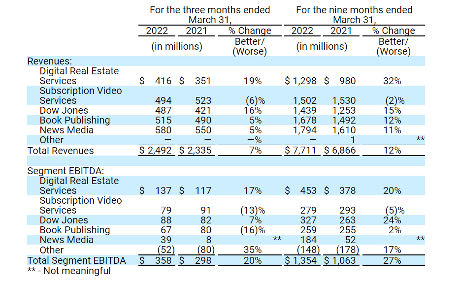 新闻集团(News Corp)今天公布了截至2022年3月31日的三个月财务业绩。