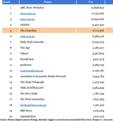 根据推特上分享的排名,《卫报》澳大利亚版在2021年1月排名第七,拥有687.8万独立读者,仅次于SMH.com.au和《每日邮报》澳大利亚版。然而,到今年6月,《卫报》澳大利亚版首次超过了SMH.com.au和《每日邮报》澳大利亚版,跃升至第五位。