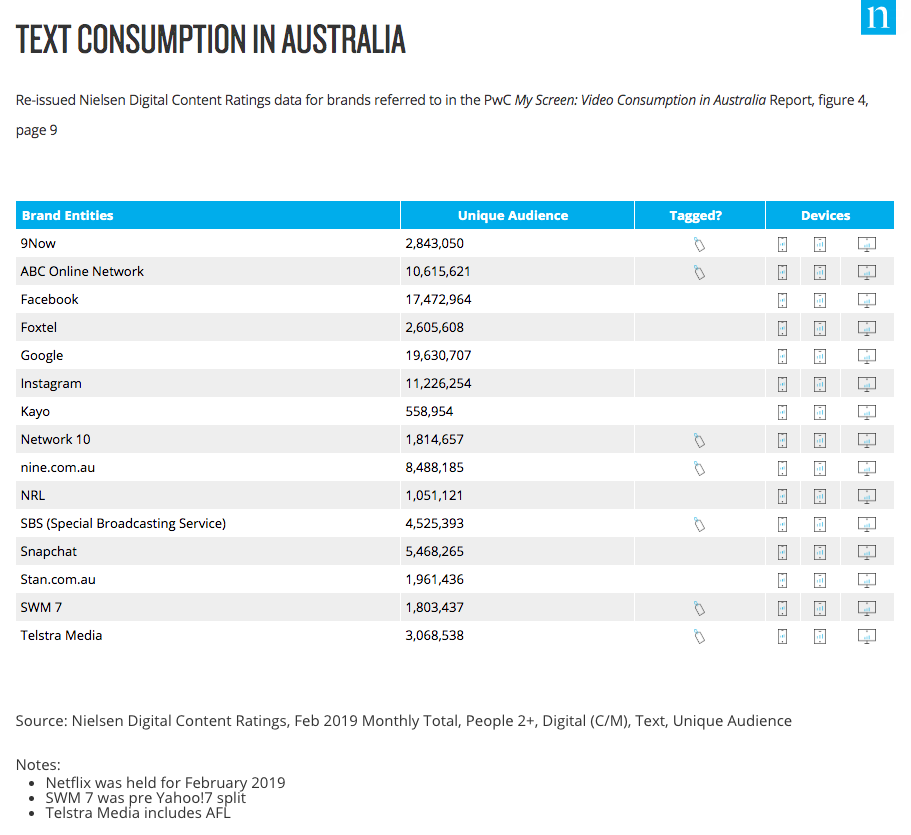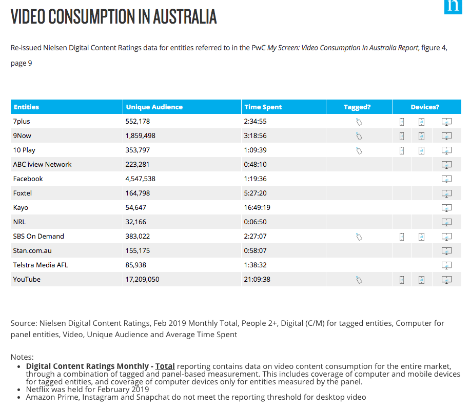 从尼尔森的角度来看,Mumbrella理解该报告的一个关键问题是在第9页,其中使用了尼尔森数字面板数据。这个数据子集着眼于澳大利亚人访问文本内容,而不是视频消费。鉴于“我的屏幕”报告试图揭示澳大利亚人是如何花费时间消费视频内容的,尼尔森认为它的数字内容评级——可以分为文本消费和视频格式——应该被使用。