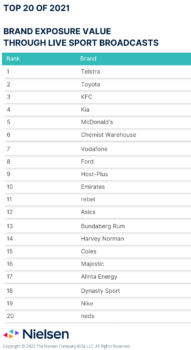 尼尔森运动提供了Mumbrella赞助商品牌的列表生成最高价值通过现场直播的体育节目在2021年,接触在昨天的Mumbrellacast。
