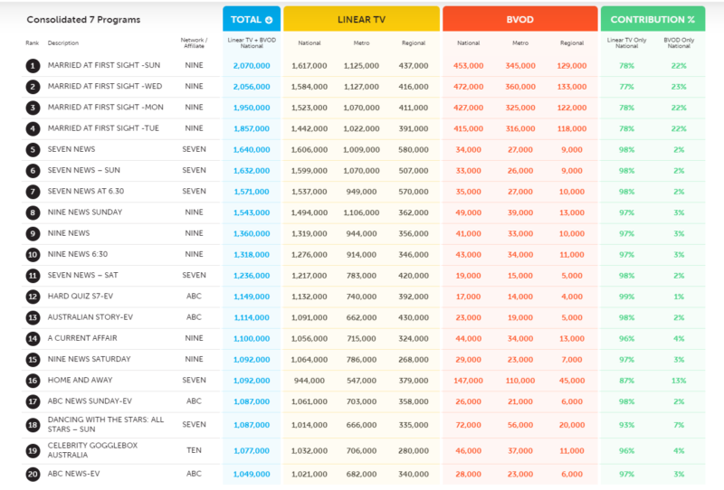 在2月27日至3月5日的报告中,娱乐计划在全国范围内获得了207万观众,BVOD贡献了22%的观众,全国BVOD的观众总数为453,000。上周MAFS也顶了第9周, 也第8周, 和第7周。