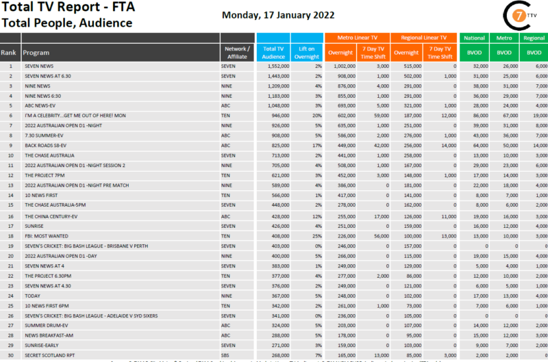 在1月17日最新的每日综合电视总报告中,Seven News是全国排名第一的节目,拥有102万观众,其中包括32000名BVOD观众,同比增长2%。