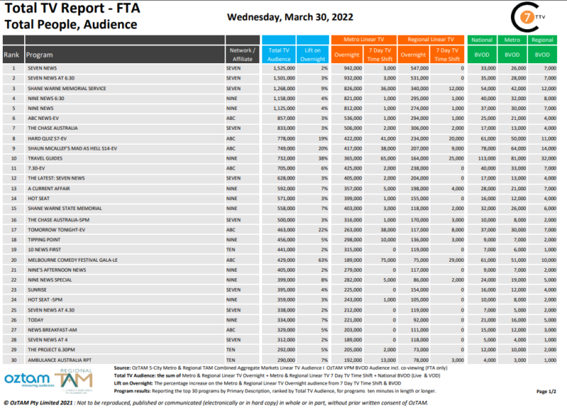 在3月30日的最新每日整合电视报告中,有七个消息以152.5万电视观众的身份,其中包括33,000名BVOD的观众,增长了2%。最高兴奋的节目是ABC的墨尔本喜剧节盛会,升高为63%,共有429,000台电视观众和61,000名BVOD。