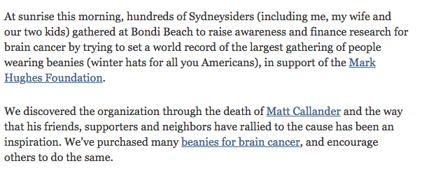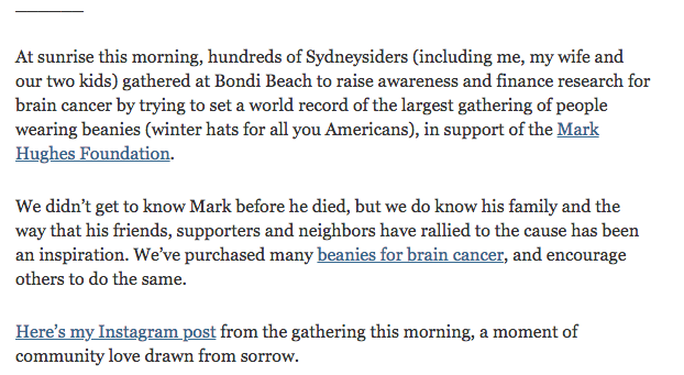 在周四发给读者的每周电子邮件中,凯夫分享了他和家人一起去邦迪海滩的故事,为马克·休斯基金会筹集资金,为脑癌研究筹集资金。