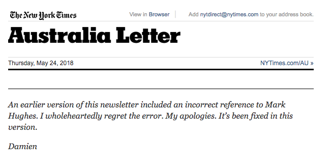 几个小时后,新版本的电子邮件出现在读者的收件箱里,凯夫表示道歉,他声称认识休斯家人的说法现在被删除了。相反,他提到了Nine的前NRL老板马特·卡兰德在2017年去世。