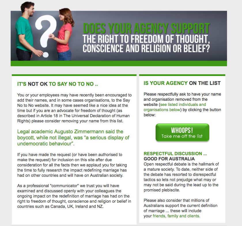 这封邮件称,它旨在围绕同性婚姻问题展开“尊重的讨论”,提醒那些在“说不对不”网站注册的人,许多澳大利亚人支持目前的婚姻定义。