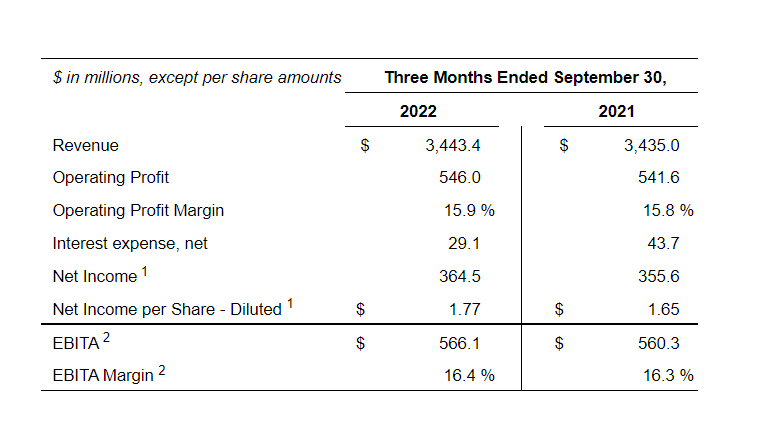 与2021年第三季度相比,营业利润增加440万美元(690万澳元),至5.46亿美元(8.65亿澳元),增长0.8%。相关营业利润率为15.9%,而2021年第三季度为15.8%。