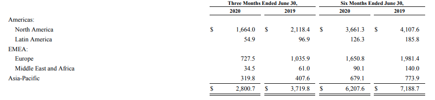 在亚太地区,本季度收入为3.198亿美元,较去年第二季度下降27.5%,而半年收入为6.791亿美元,下降12.2%。