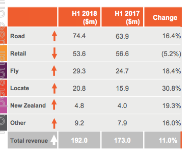 与2017年同期相比,2018年上半年公路收入增长了16.4%,达到7440万美元。Fly上涨了18.4%,至2930万美元,locate上涨了30.8%,至2080万美元。来自新西兰的收入为480万美元(较2017年上半年的400万美元增长了19.3%)。