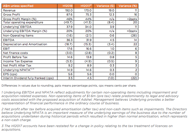 基础EBITDA(息税折旧及摊销前收益)增长11%至3790万美元,而基础NPATA(收购摊销前税后净利润和诸如减值等非现金项目)增长2%至1490万美元。