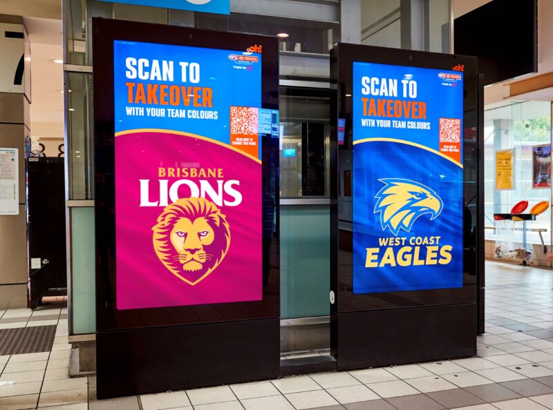 使用一个独特的每个数字面板上的二维码,澳式足球联盟,聚哦!创意,内容和营销技术团队,开发了一个媒体歌迷直接指向一个网站与应用程序和接管屏幕的背景与他们喜爱的球队的颜色…当然,直到下一个热情的球迷改变它。