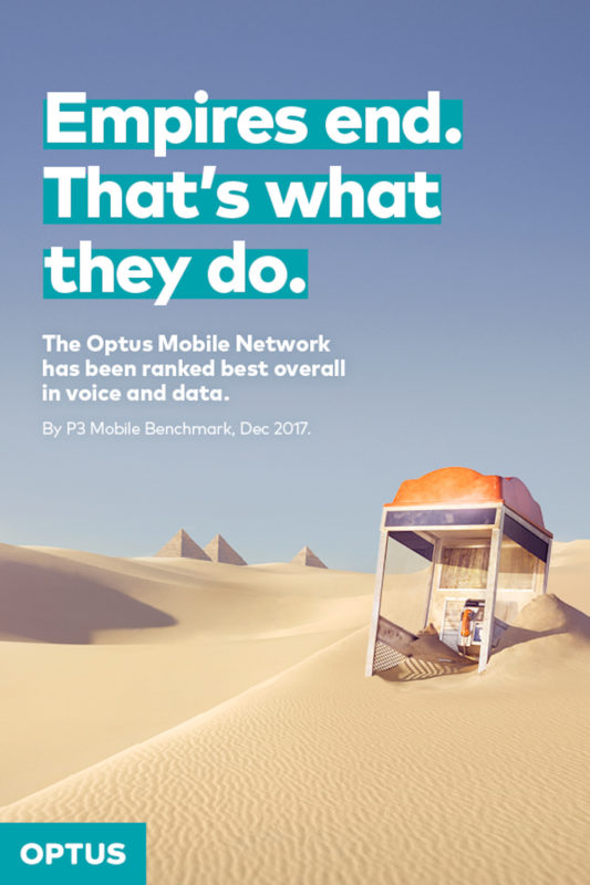 Optus的户外和网上活动由他们的内部机构Yes Agency,5月初跑。广告采用手机盒,清晰可识别为Telstra Payphone,躺在沙漠中,标题:“帝国结束。这就是他们所做的。“其次是声明“Optus移动网络已经在语音和数据中排名最佳。”