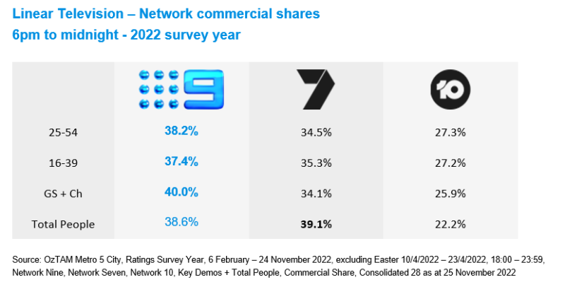 根据OzTam的数据,在2022年收视率年结束时,Seven在线性电视广告观众总数中所占的份额为39.1%,领先于Nine的38.6%和Ten的22.2%。该收视率年度不包括复活节假期,但包括澳大利亚网球公开赛。